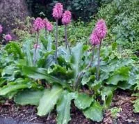 Shiny, broad wavy-edged leaves, and spikes of drooping, tubular, dusky pink flowers in early spring. ‘Lemon Flame’ has pale yellow flowers. Excellent container plants for shady patios.