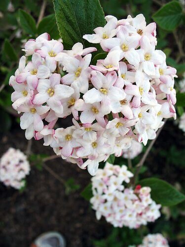 This plant has white and cream to pink-flushed or wholly pink flowers in spring.